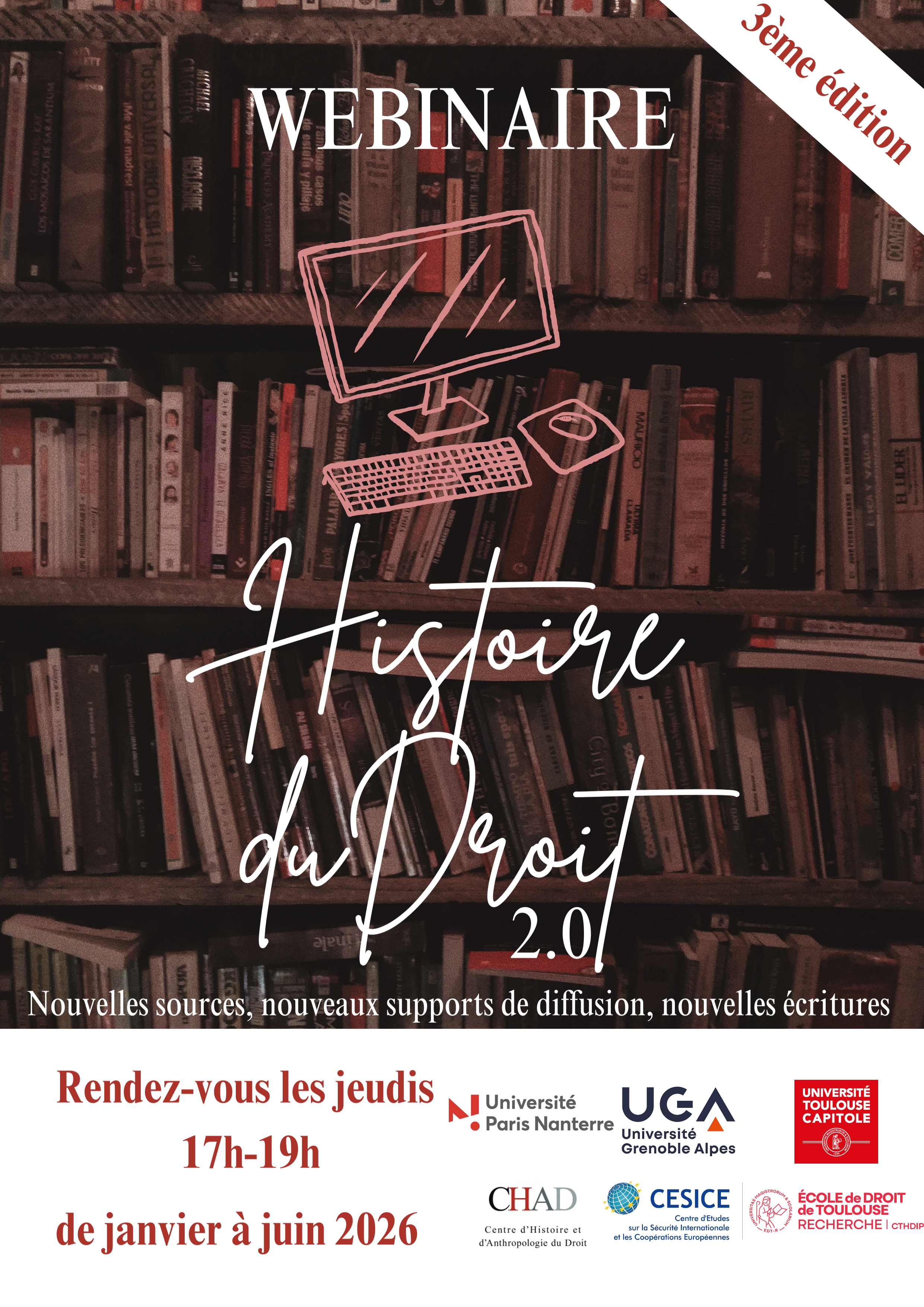Il s'agit de la troisième édition du webinaire Histoire du droit 2.0. autour des pratiques numériques et innovantes en histoire du droit. Ce séminaire est ouvert à toute personne intéressée par l’un des thèmes abordés, dans la perspective de favoriser un dialogue interdisciplinaire et fécond.