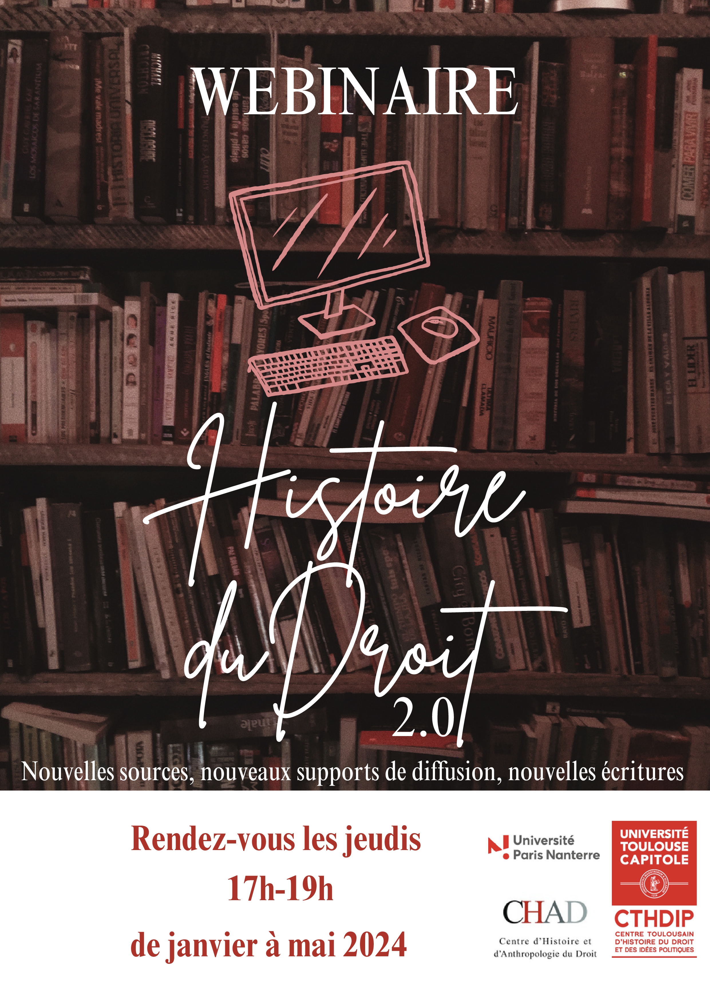 Le Webinaire "Histoire du Droit 2.0. Nouvelles sources, nouveaux supports de diffusion, nouvelles écritures" est organisé par Louise Testot-Ferry (UT Capitole/CTHDIP) et Ninon Maillard (Université Paris Nanterre/CHAD).