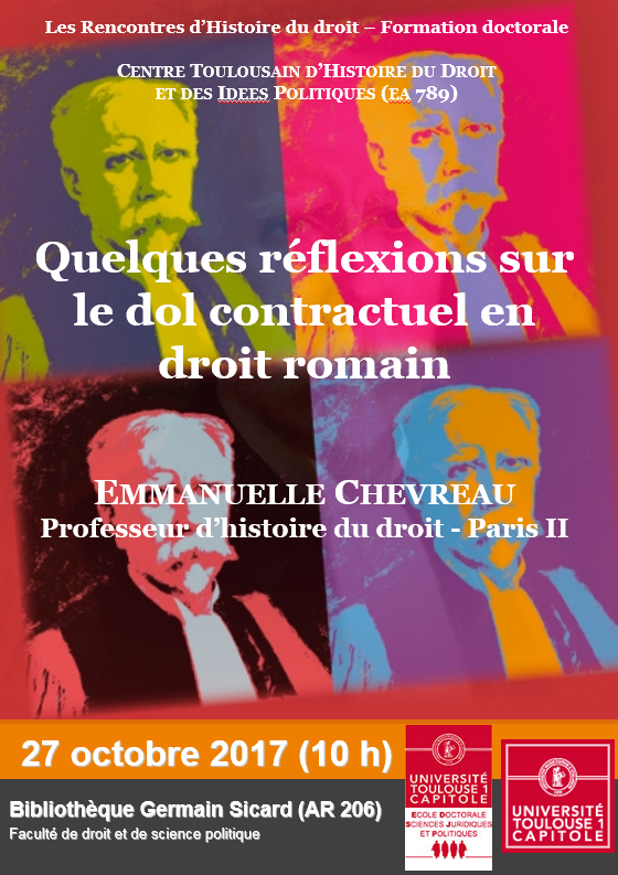 Dans le cadre des Rencontres du CTHDIP, Mme Emmanuelle Chevreau, professeur d'histoire du droit à Paris 2, interviendra sur la question du dol contractuel et de l'utilisation du droit romain dans l'écriture d'une histoire du dol.
