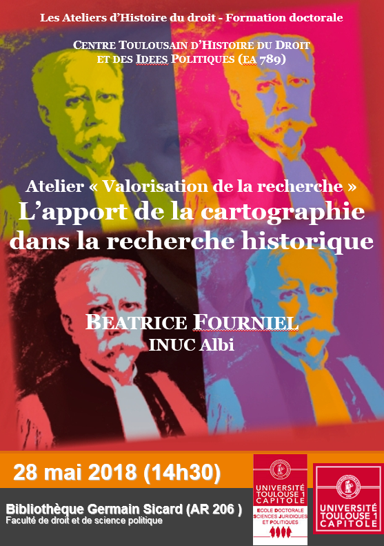 Dans le cadre des "Atelier d'histoire du droit", Béatrice Fourniel (INUC Albi) animera un atelier "Valorisation de la recherche" sur l'apport de la cartographie dans la recherche historique. Cet atelier est ouvert à tous les doctorants. Il se déroulera le 28 mai à 14h30 en salle AR206 (Bibliothèque Germain Sicard).